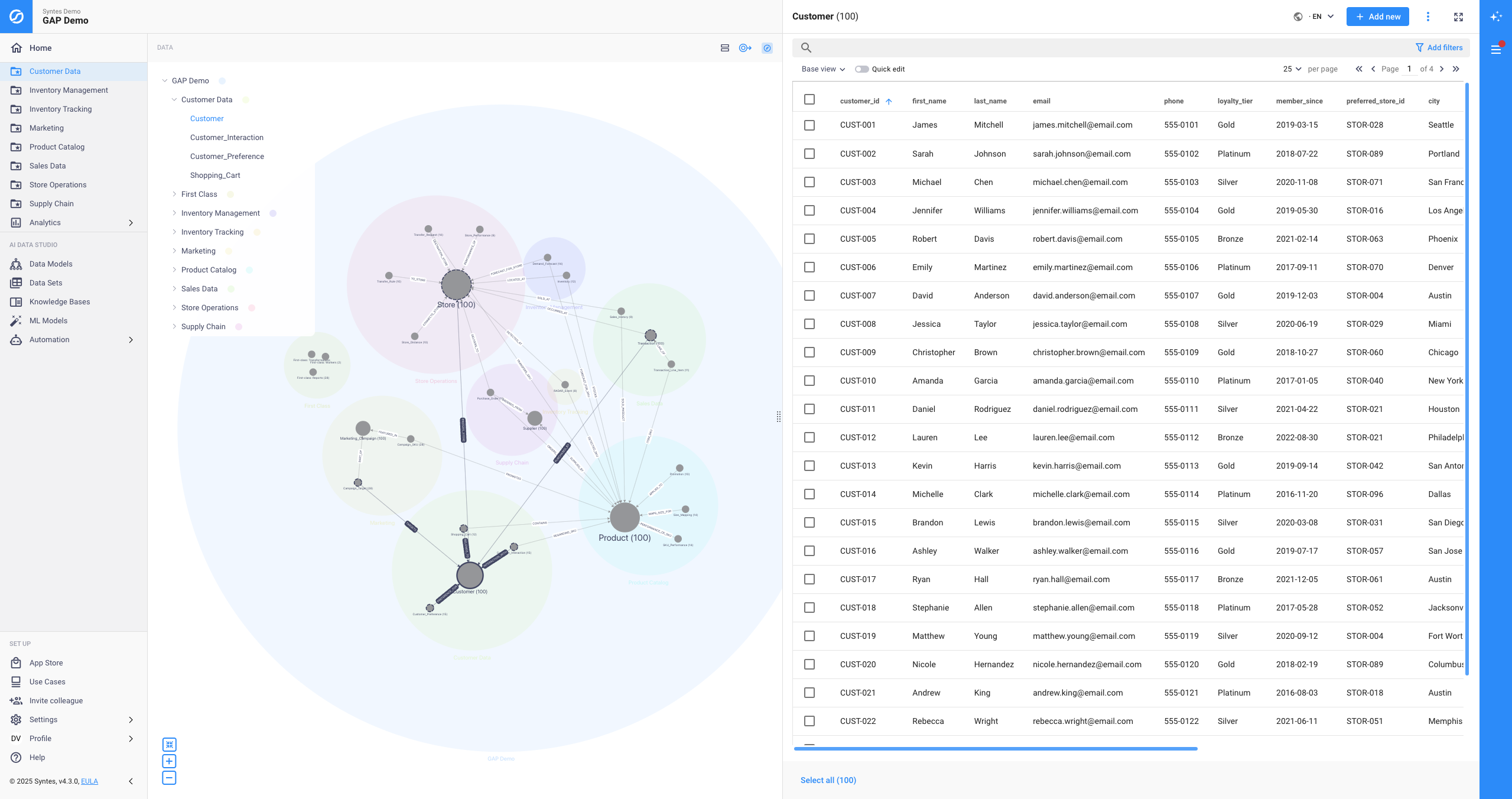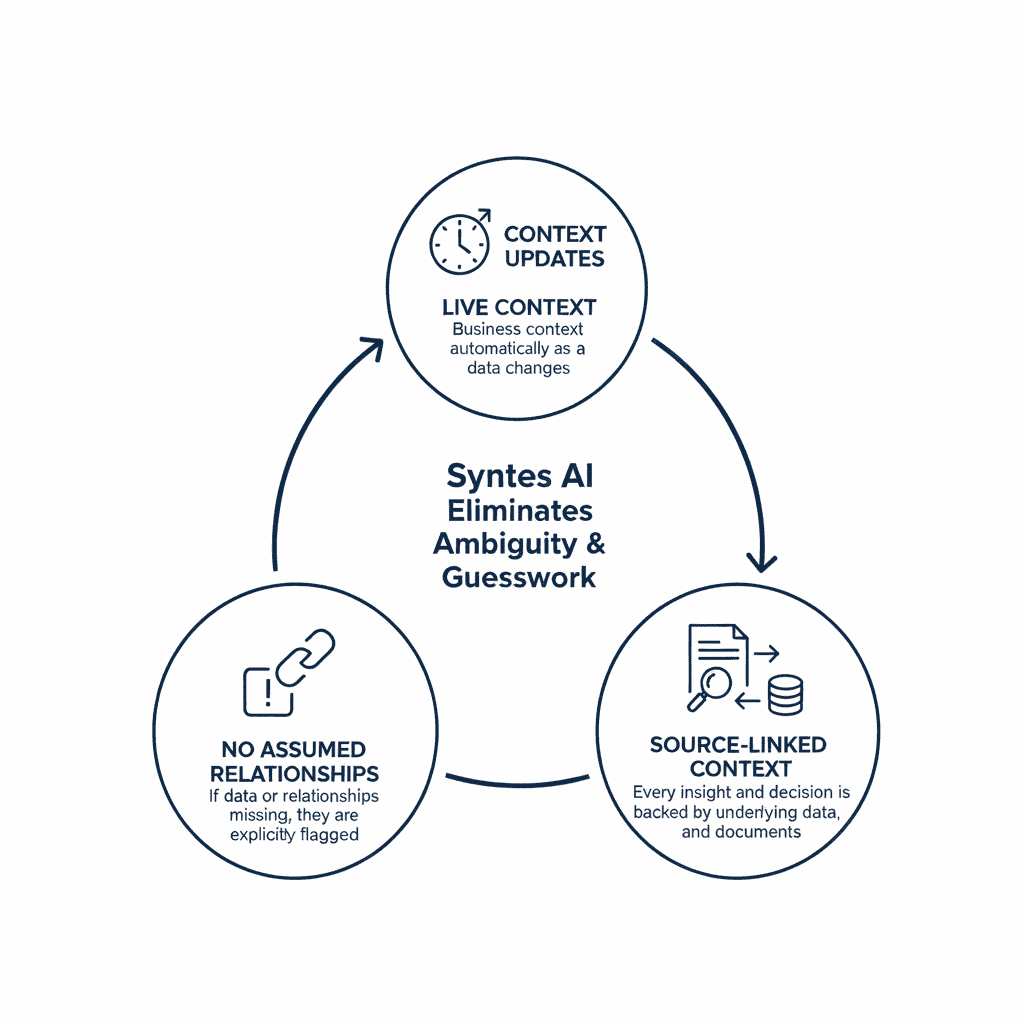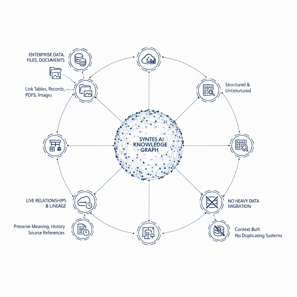 Syntes AI automatically generates live business context by unifying enterprise data, documents, and relationships into a continuously evolving knowledge layer—powering accurate analytics, explainable AI, and safe execution.