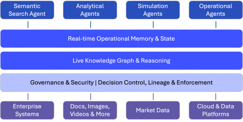 Deploy search, analytical, simulation, and operational agents that reason over context, evaluate scenarios, and execute actions under defined policies and human oversight.